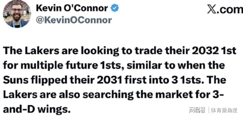 雅虎体育记者Kevin O'Connor在播客里“大揭秘”,湖人正琢磨着用他们2032年的首轮签,去换好几个未来的首轮签呢,这操作跟太阳之前把2031年首轮变成三个首轮的玩法有点像,就像变魔术一样。同时呢,湖人还在市场上像个寻宝猎人一样找3D侧翼,打算把文森特和范德比尔特打包起来,拿去跟别人做交易。
